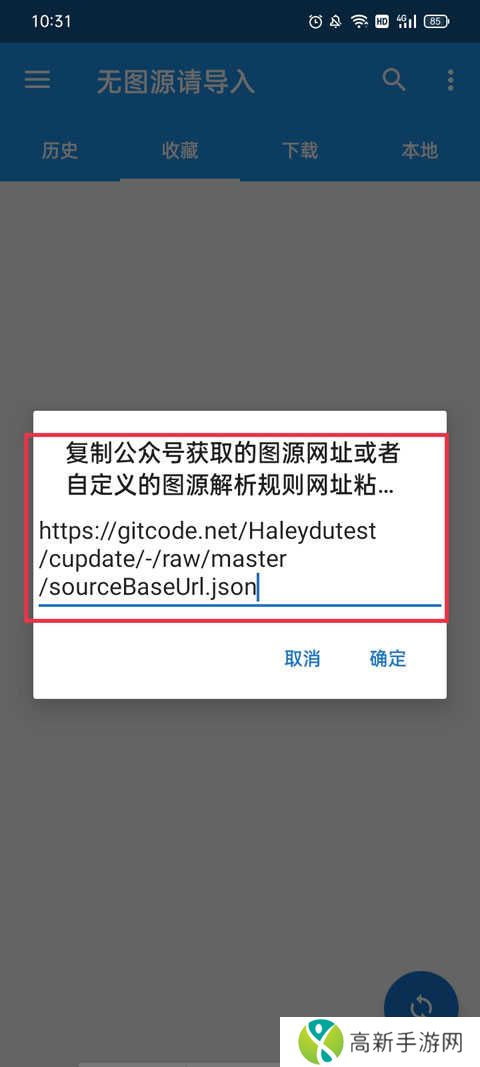 1、同样还是打开app,这时会弹出一个复制公众号……等等提示,将第三方图源网址复制到这里。