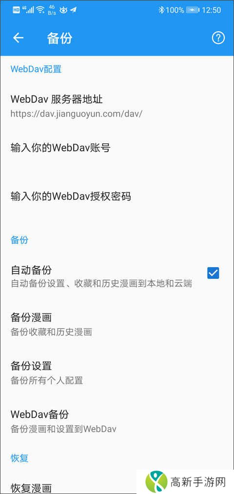 设置好备份之后每次退出App,点开漫画超过3次会自动进行备份,需要开启自动备份。设置了webDav服务器的可以自动备份到服务器。