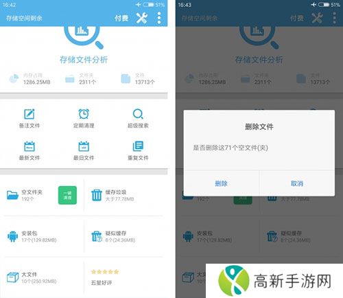 不知道空文件夹在哪里清理,不过存储空间清理比较方便,在首页就有一键清理,清理起来挺爽的;