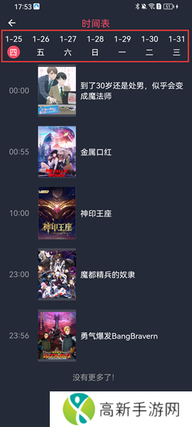 4、点击首页右上角的日历图标即可查看时间表,这里每天都会更新最新的动漫内容。通过左右滑动切换日期,用户可以找到自己感兴趣的动漫。