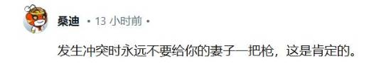 网友调侃称,“看来你老婆选择了低荣誉值通关的玩法。以后吵架的时候,千万不要让你的老婆拿到枪”、“你老婆上辈子应该是个亡命之徒”。
